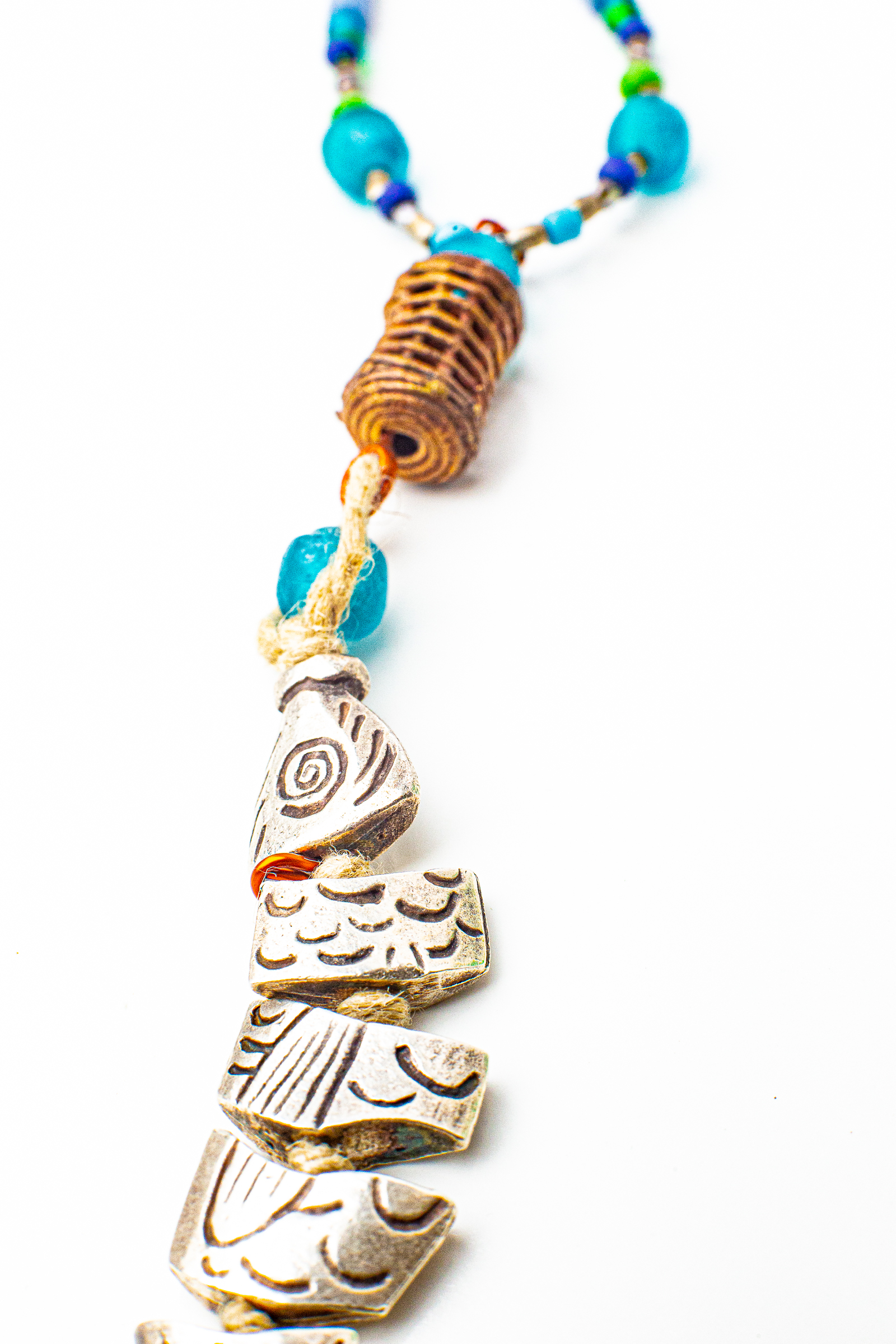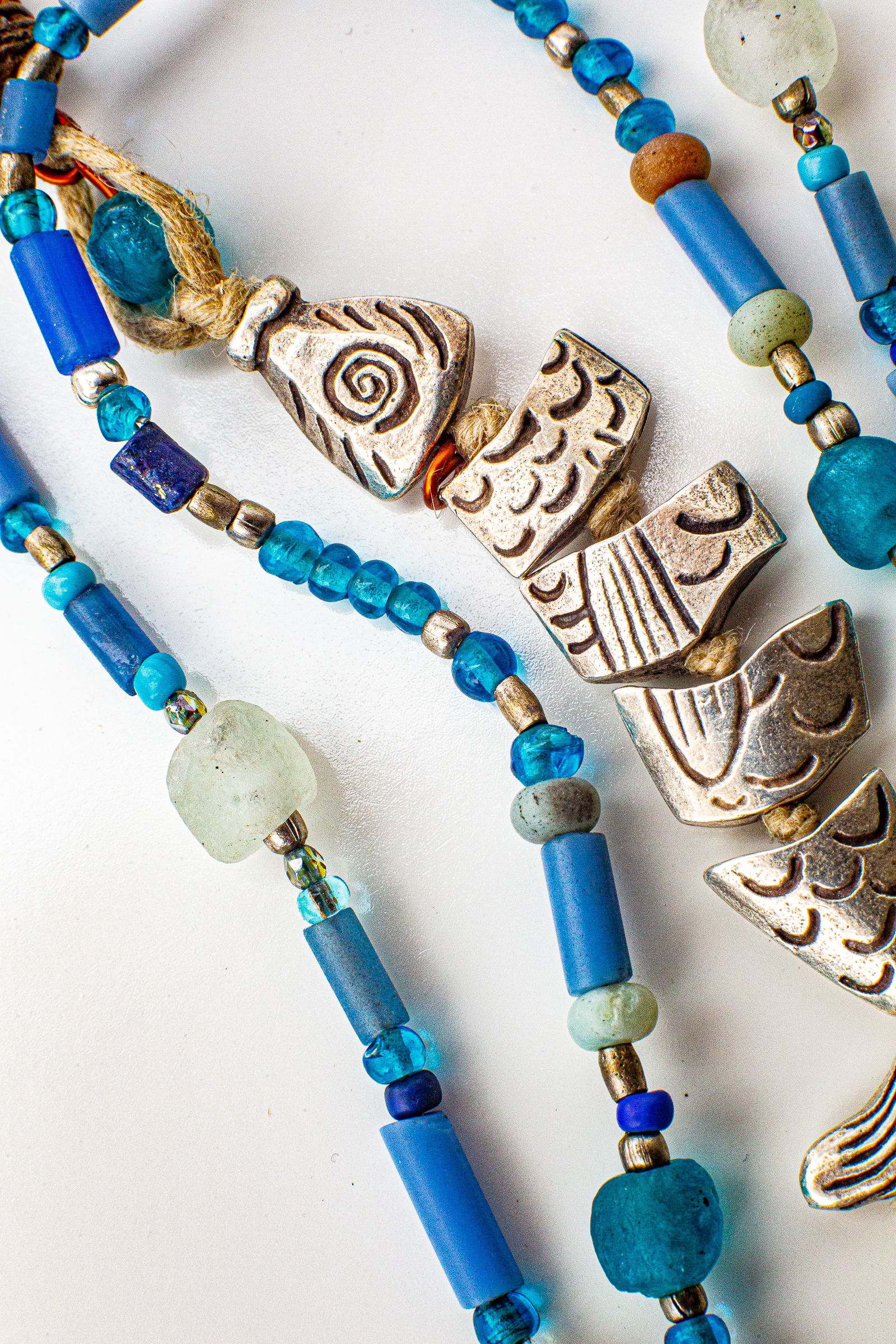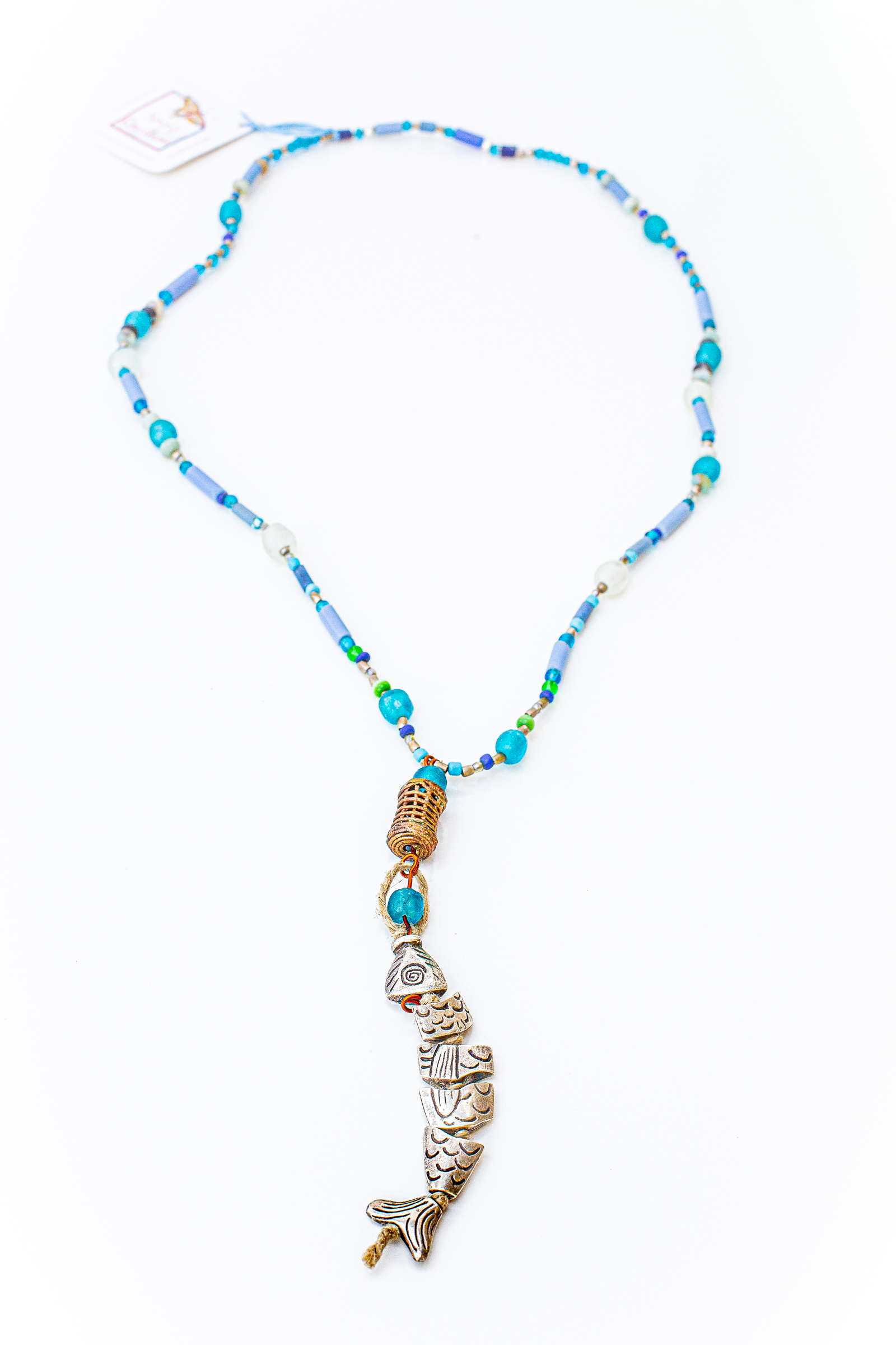 This pendant features a silver fish strung in pieces on a jute cord, with a copper bead that resembles a fishing basket. The 30” cord has no clasp, and is roomy to fit over your head. It is strung with ceramic, glass, stone and silver beads.