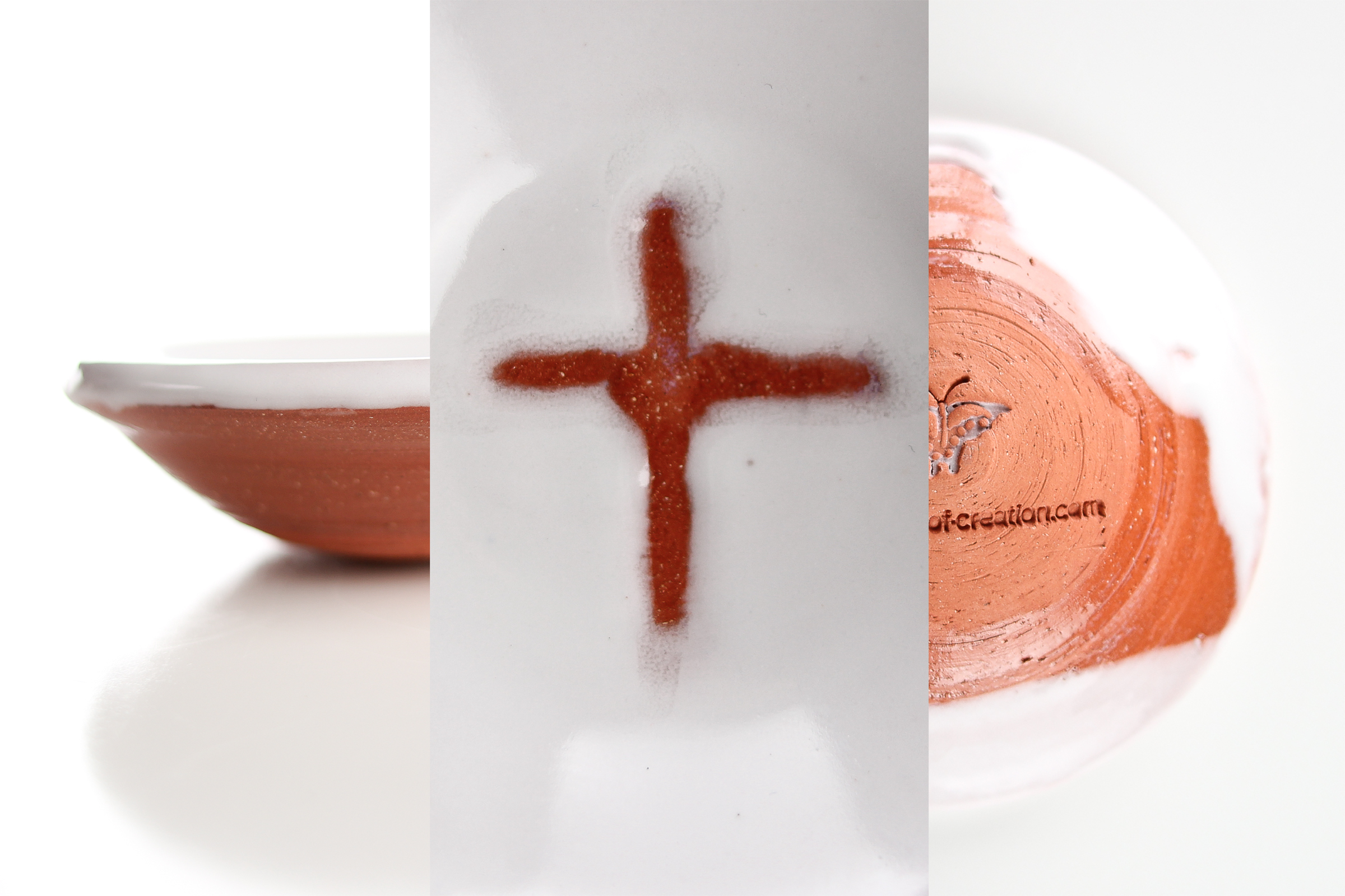 This set is the Natural Clay Cross design (other designs are available in my shop). This cross is drawn with my finger through the wet glaze to show the natural color of the clay. It is as if each piece is individually anointed! Drawn with a finger, the cross, which is a strong symbol of the power and love of God, takes on human warmth and presence. The Natural Clay Cross design reflects the humanity and divinity of Jesus Christ in a simple form.