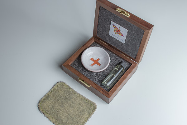• Walnut box (made in USA), custom made to fit the set, with hard foam on the inside bottom of the box, which is carved to hold the set. Soft foam lines the lid and supports the plate to cushion the ceramics for travel.