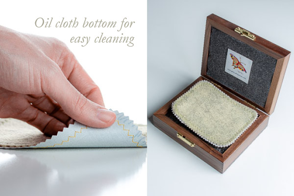 Cloth mat to set the table for your cup and oil. The bottom side is “oilcloth” cleanable by wiping with soap and water or sanitizer and the top side is a woolblend felt which is washable.