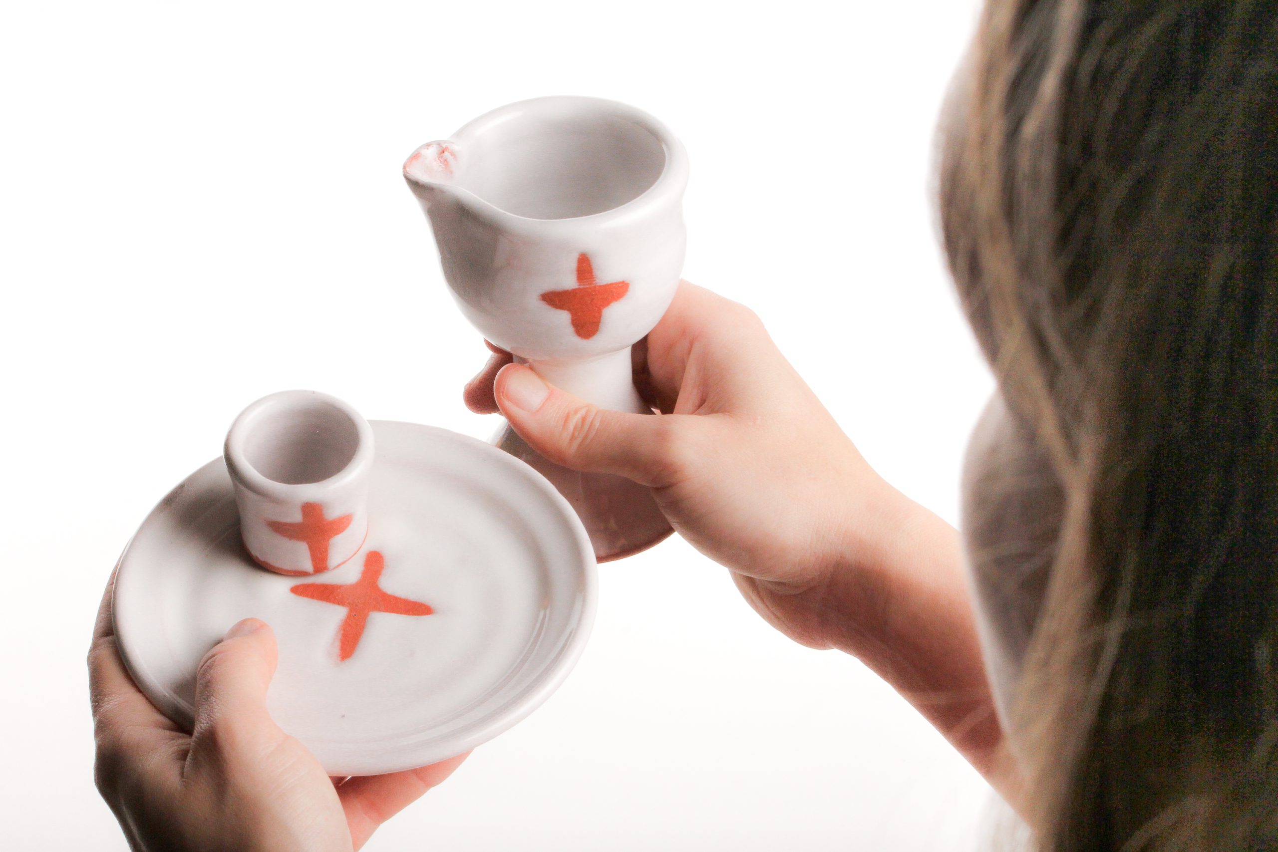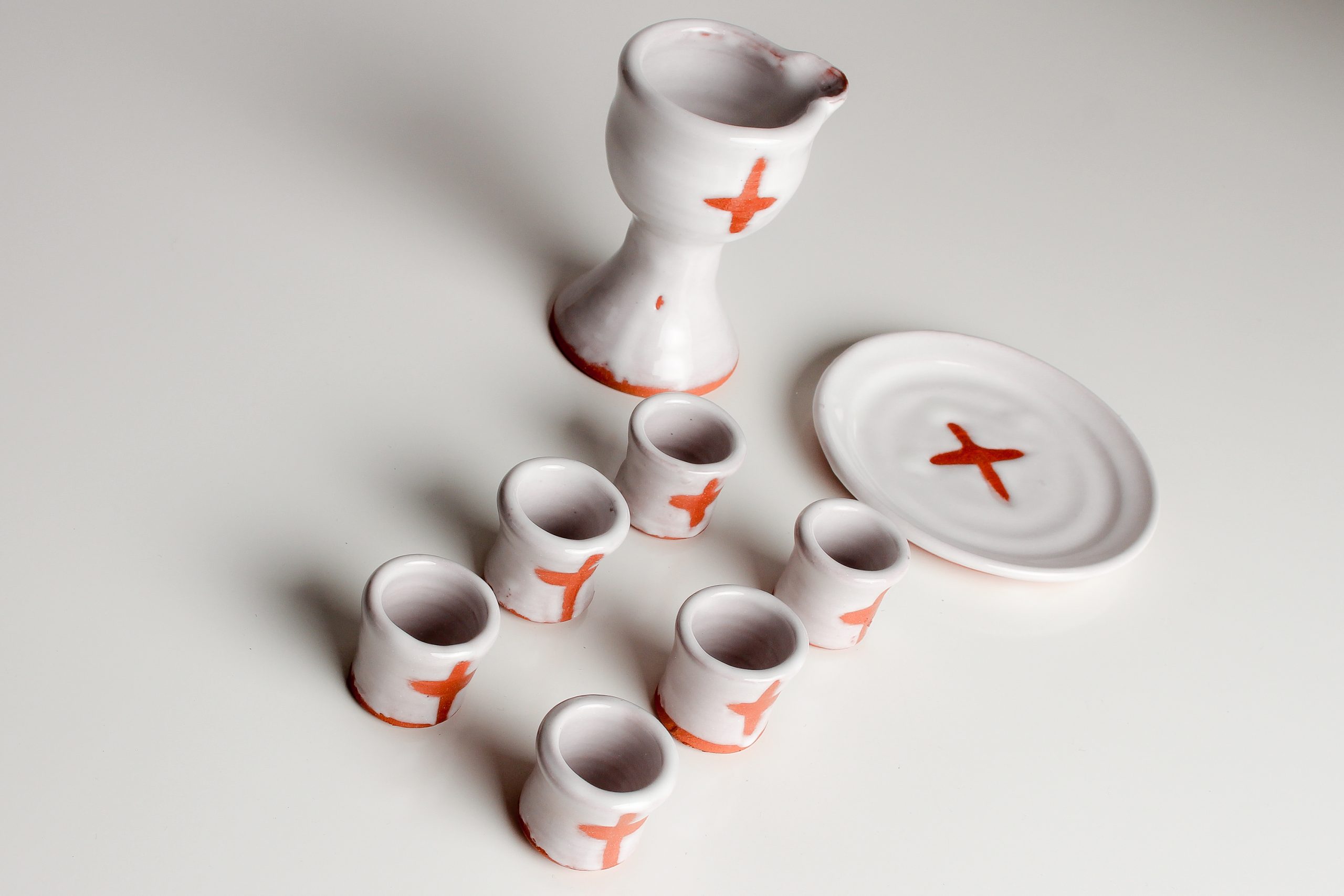 Hand-thrown and decorated ceramic communion chalice, paten and six cups
