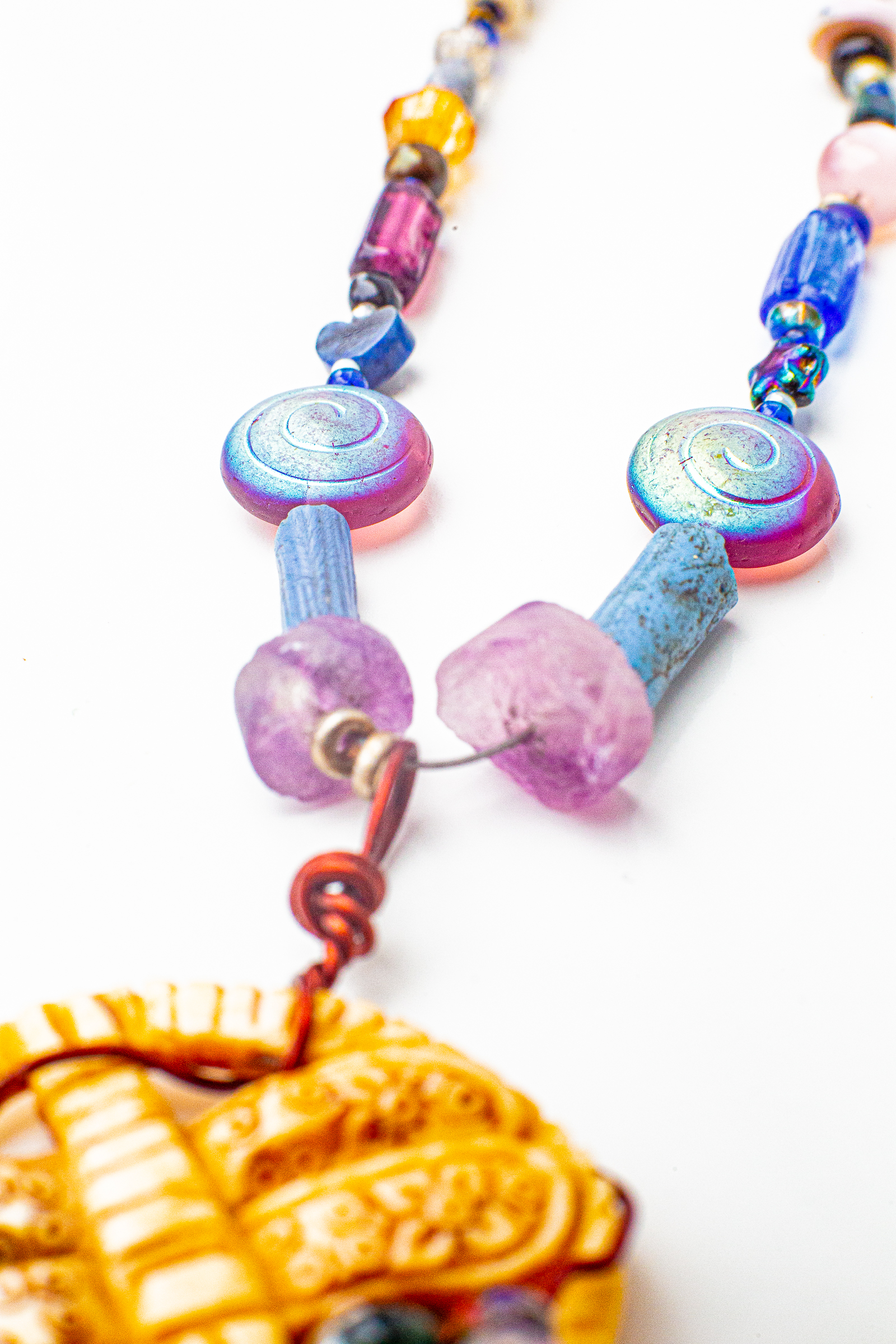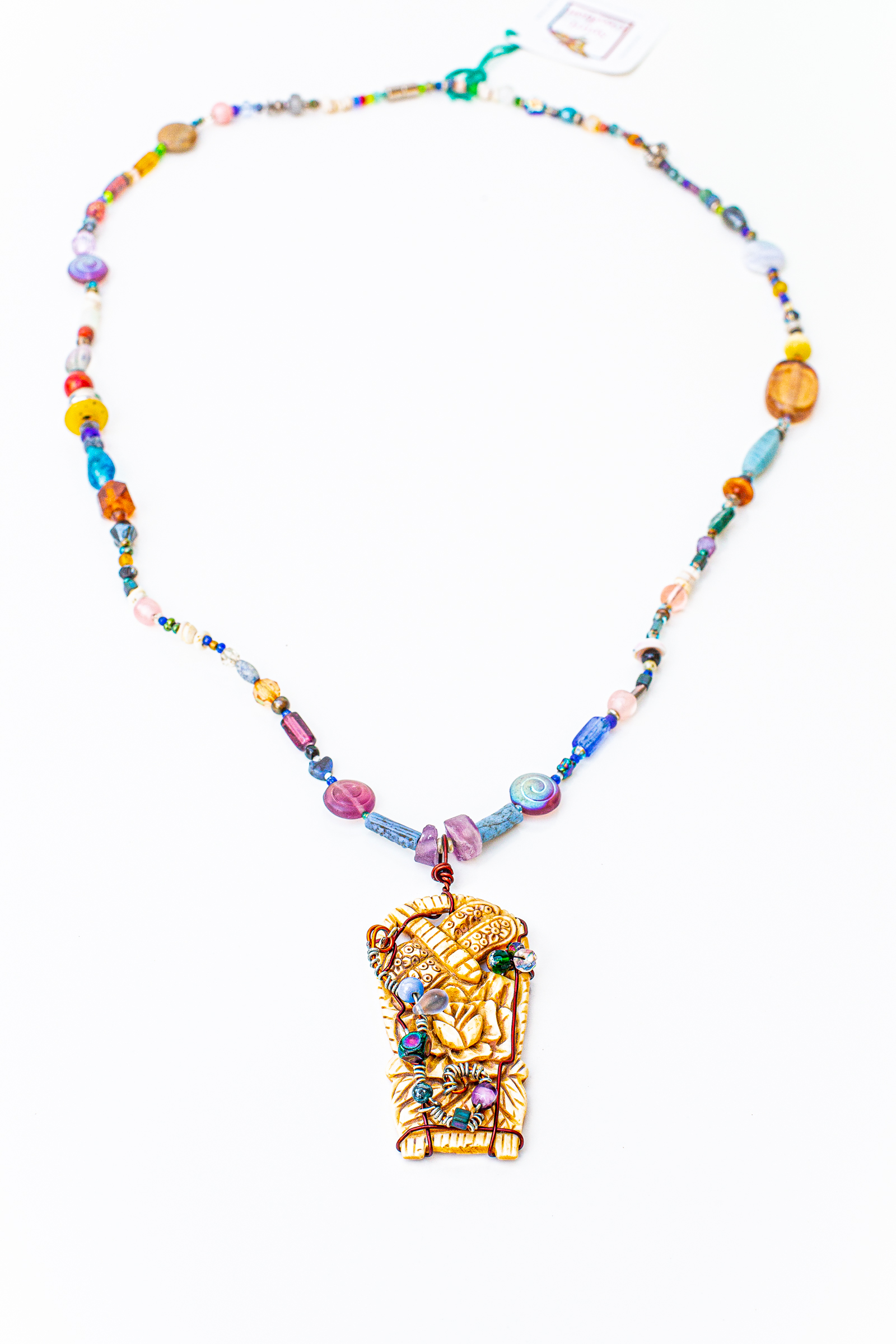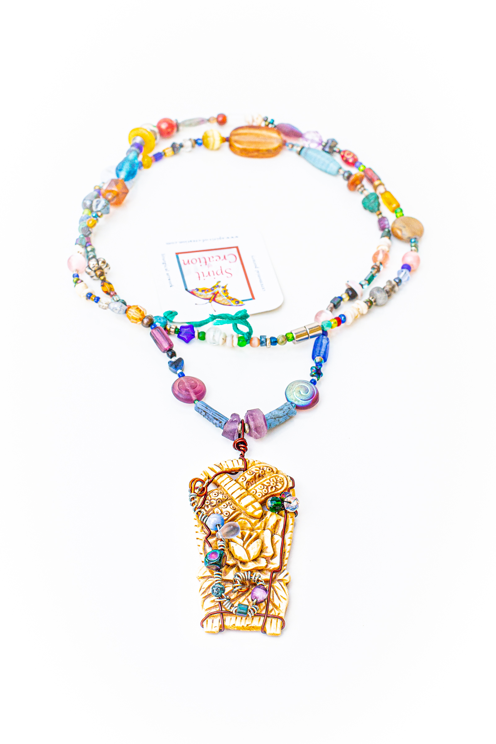 Each is one of a kind, and made by me. Many include re-purposed or vintage beads, beads and pendants from diverse cultures, made of natural materials, and some pendants hand-crafted by me.Each necklace comes in a green felt bag.