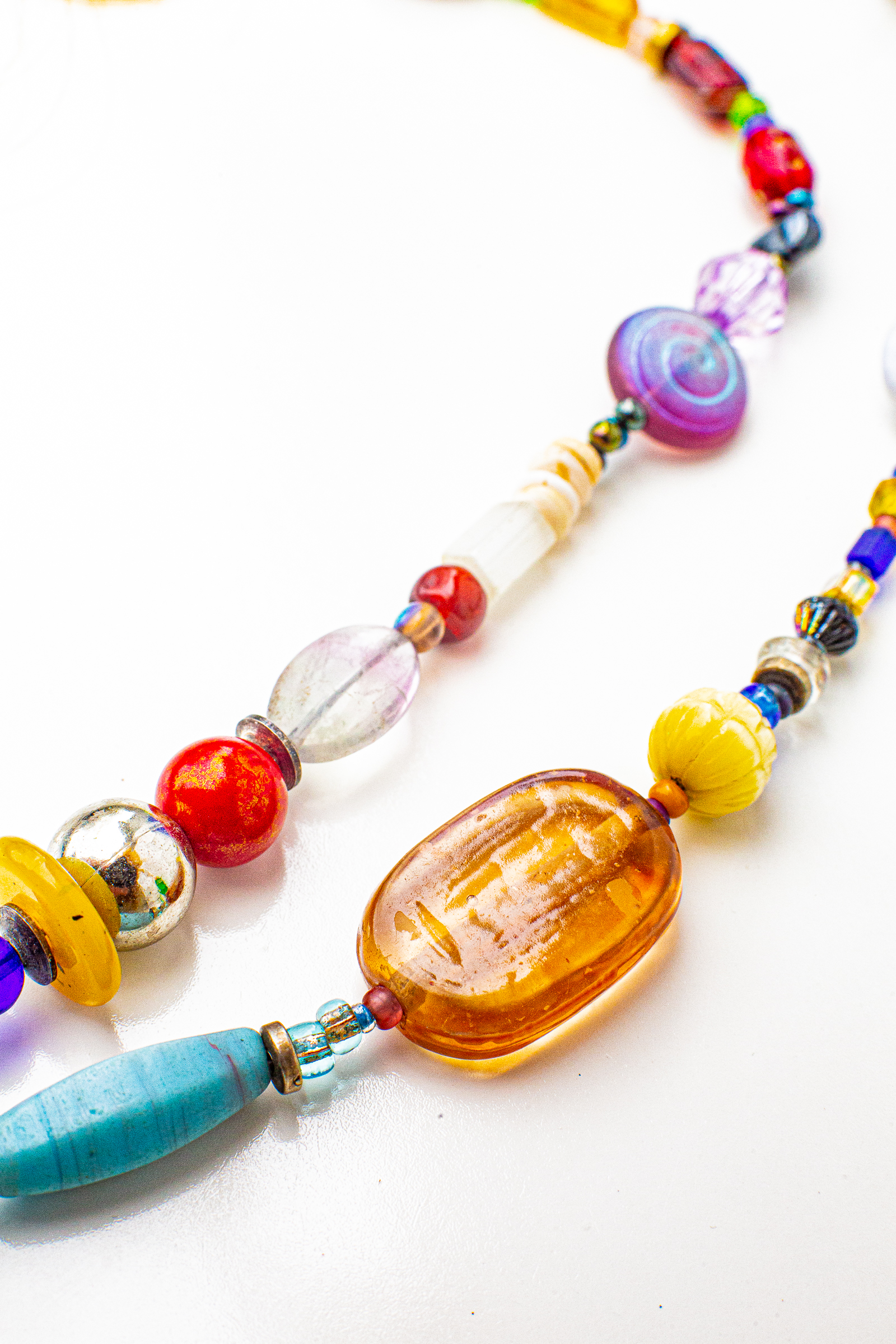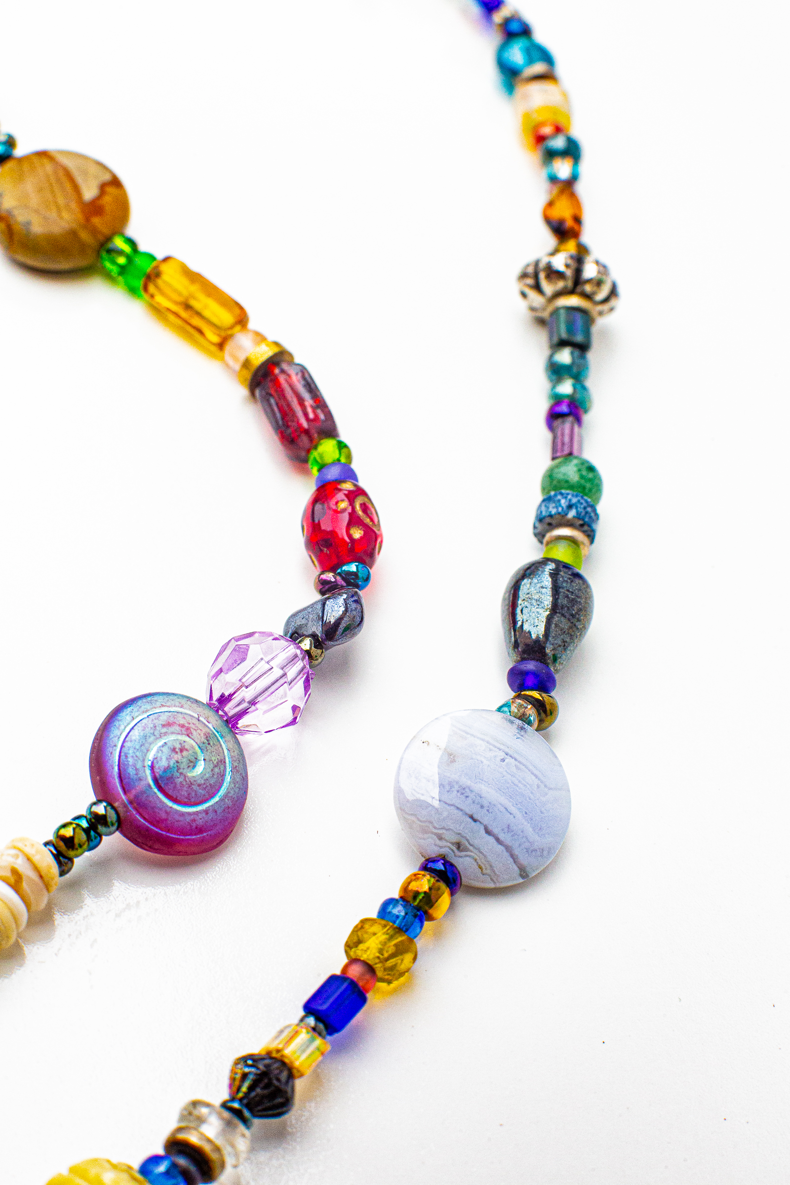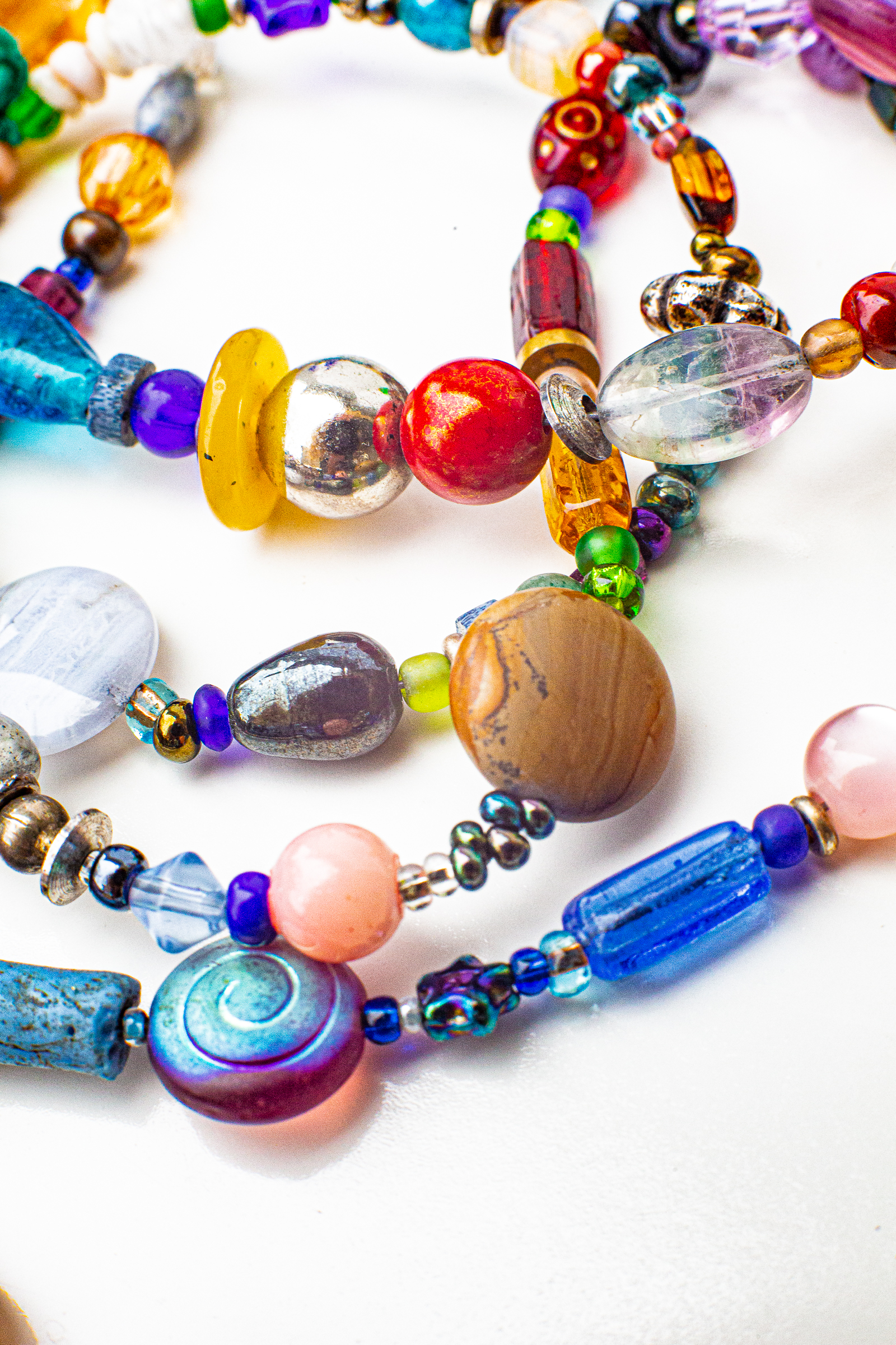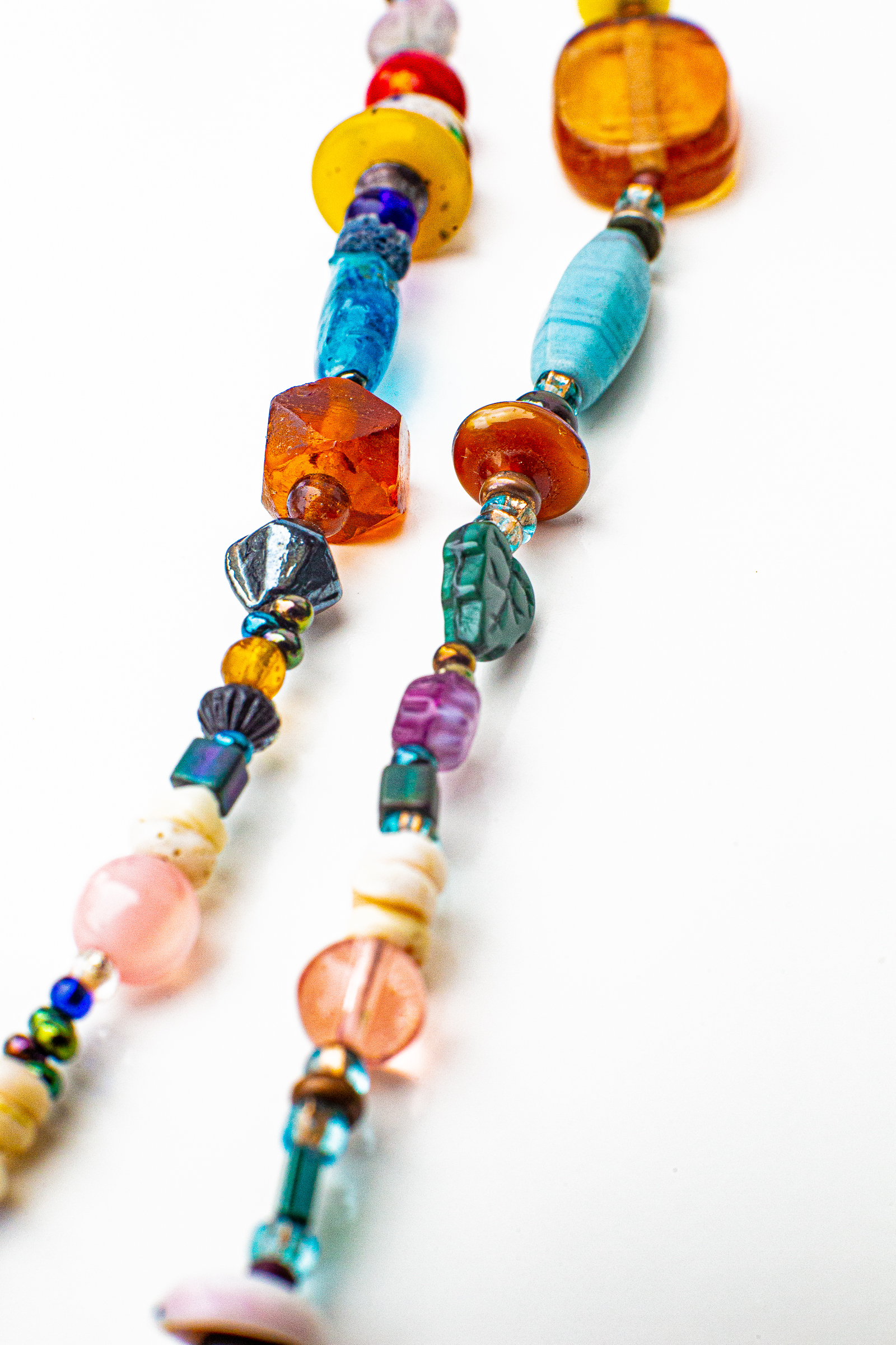 Each is one of a kind, and made by me. Many include re-purposed or vintage beads, beads and pendants from diverse cultures, made of natural materials, and some pendants hand-crafted by me.Each necklace comes in a green felt bag.