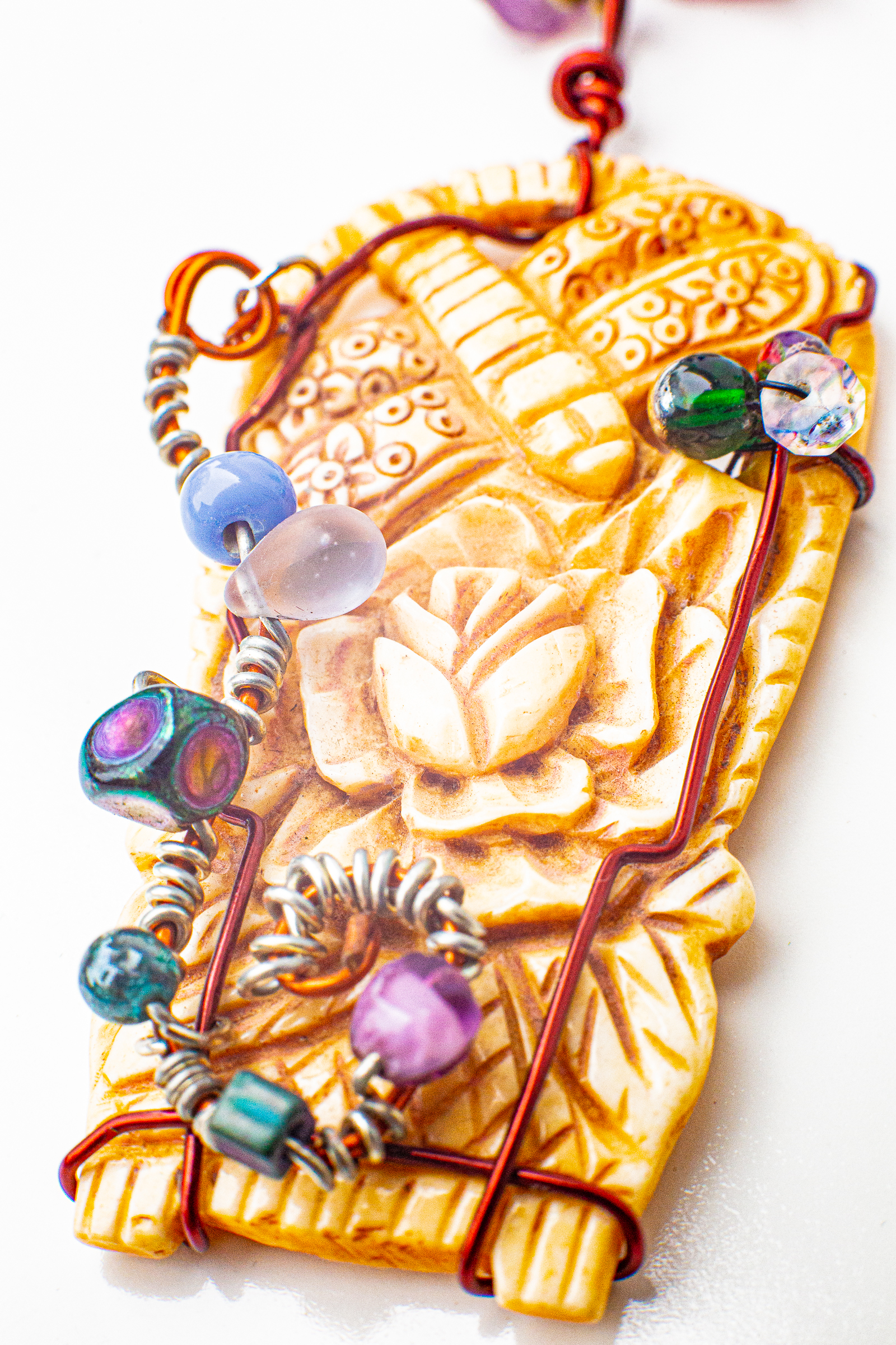 Beads of bone, glass, metal, and stone comprise this 36” cord, which can be doubled to make it shorter. Magnetic clasp. The wire and bead-wrapped pendant features a dragonfly and a flower, which symbolize transformation and blossoming into new life.
