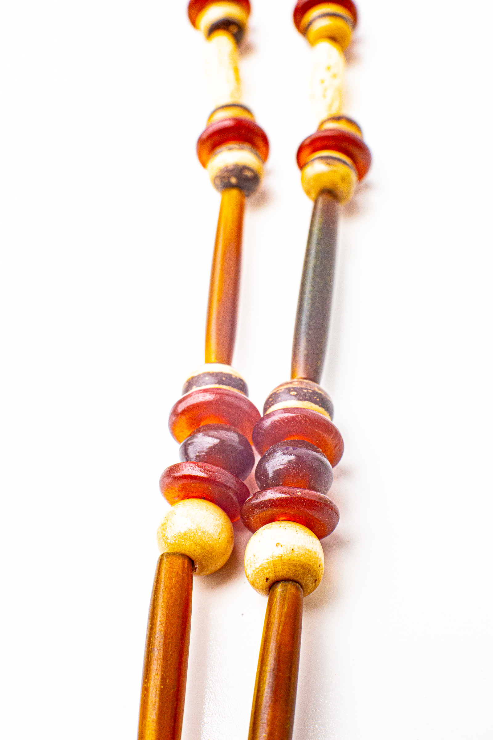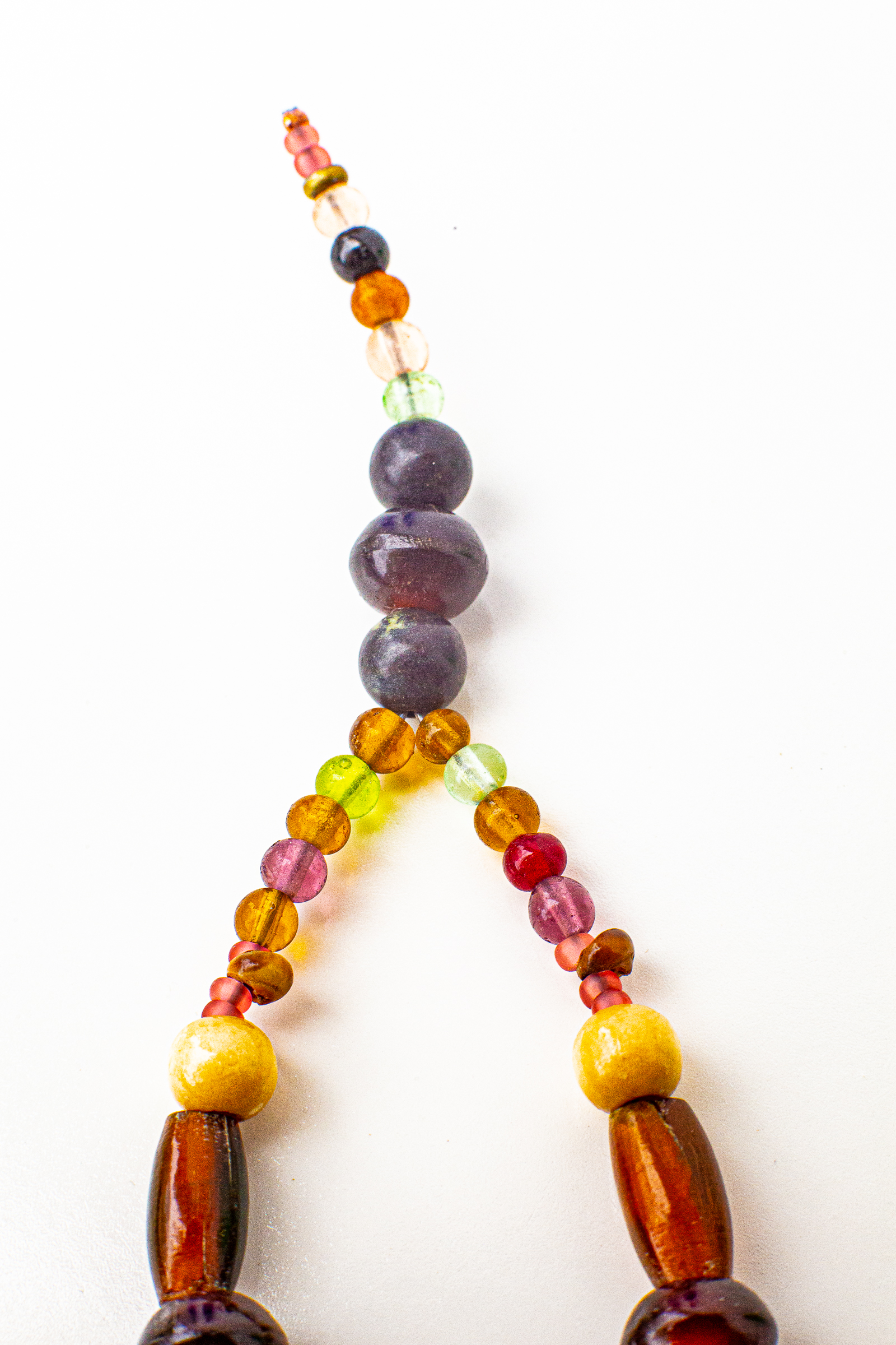 A 28” cord strung with African horn, glass, and wood beads makes a strong holder for the 2” metal cross. The finial tail, instead of clasp, is an additional 2”.