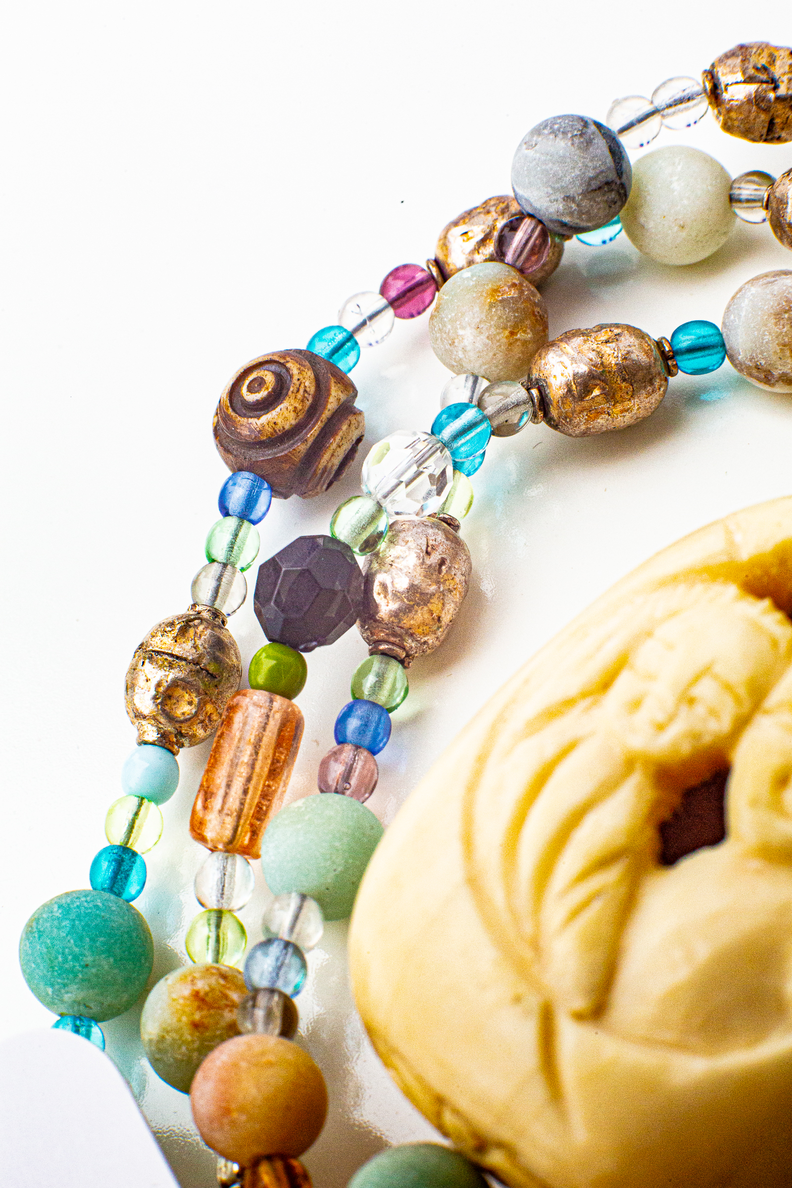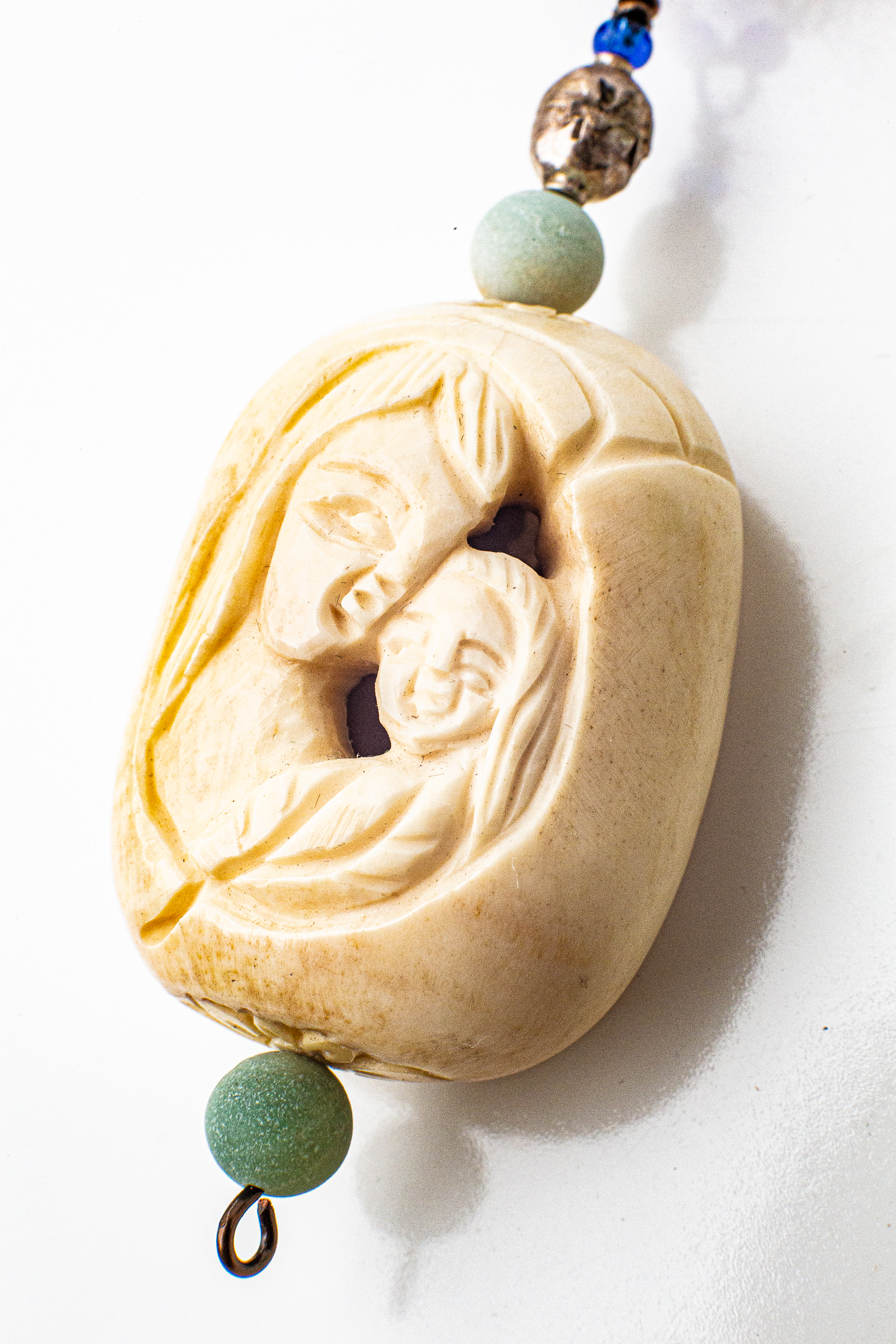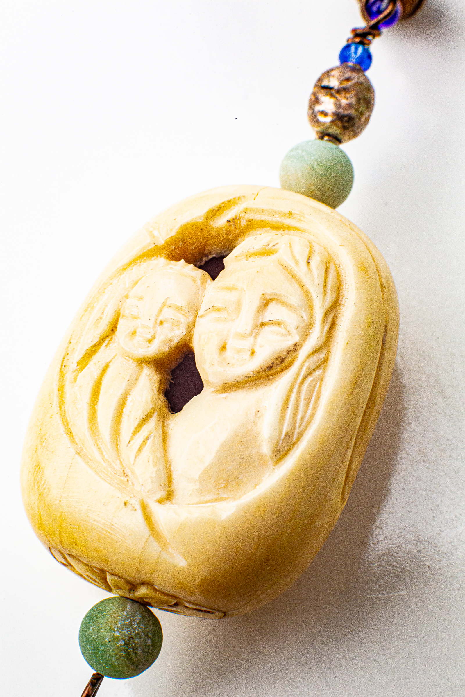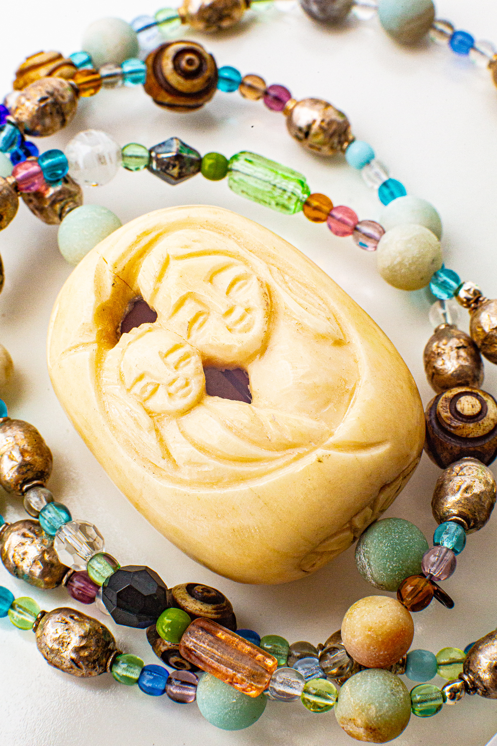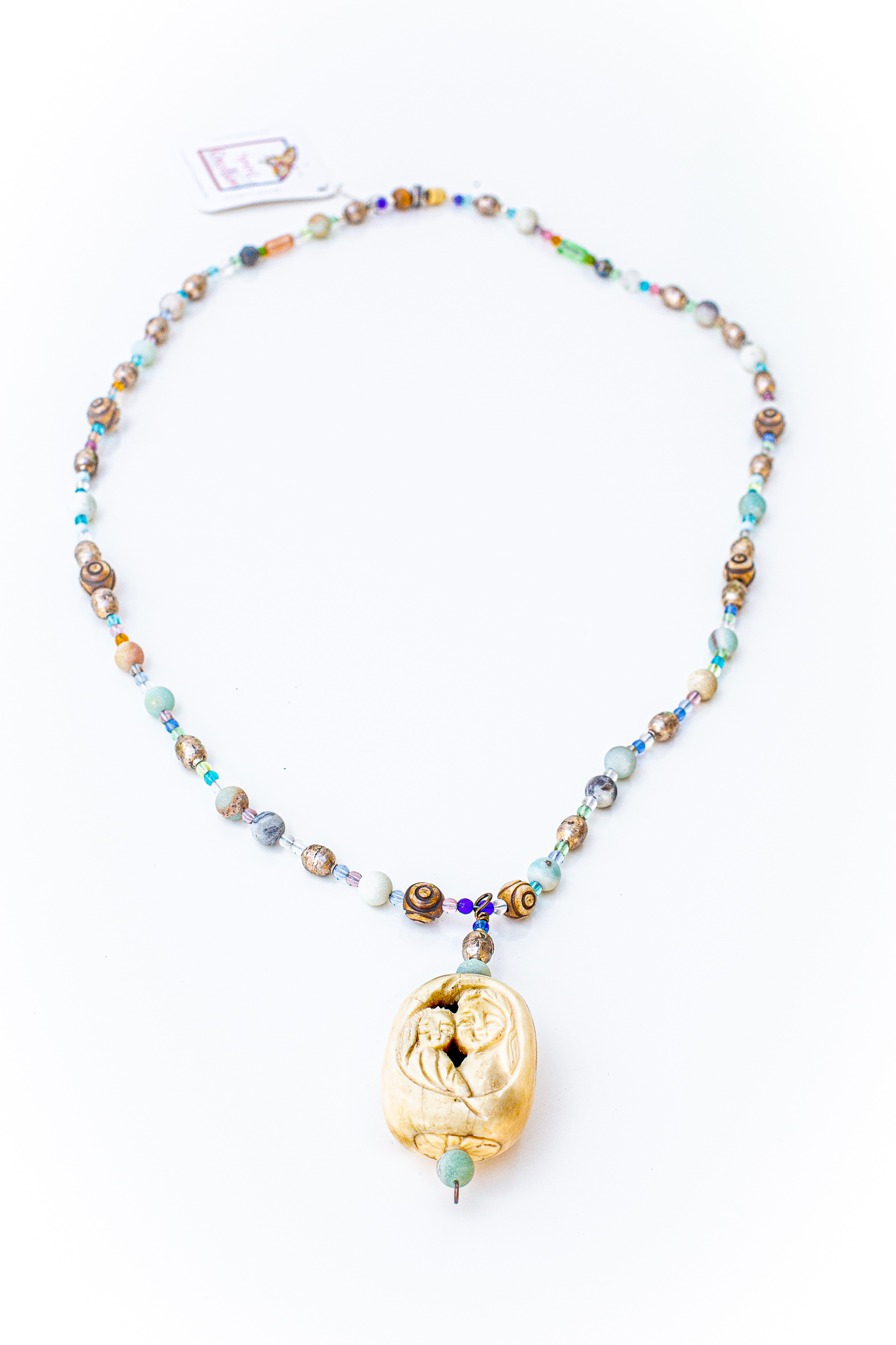 Horn pendant is double-sided, and has different expressions on each side. The 32” cord had a magnet clasp which enables doubling of the cord if you would like to wear the necklace higher some days. The beads are glass, stone, and silver.