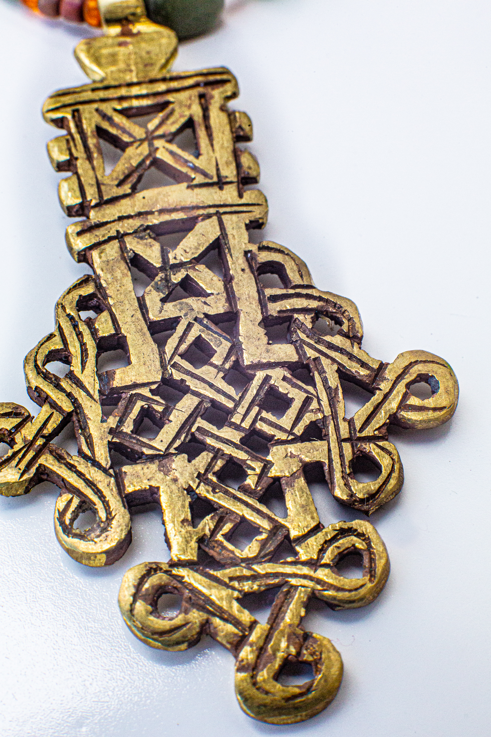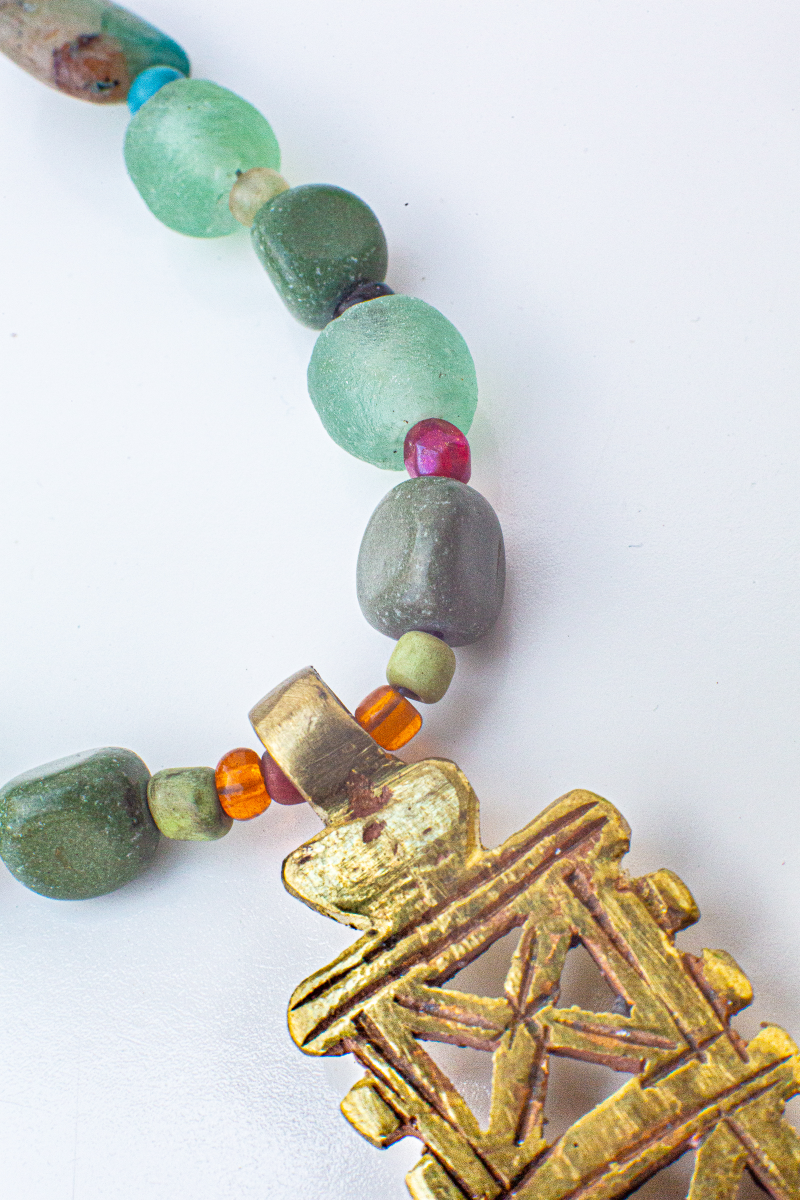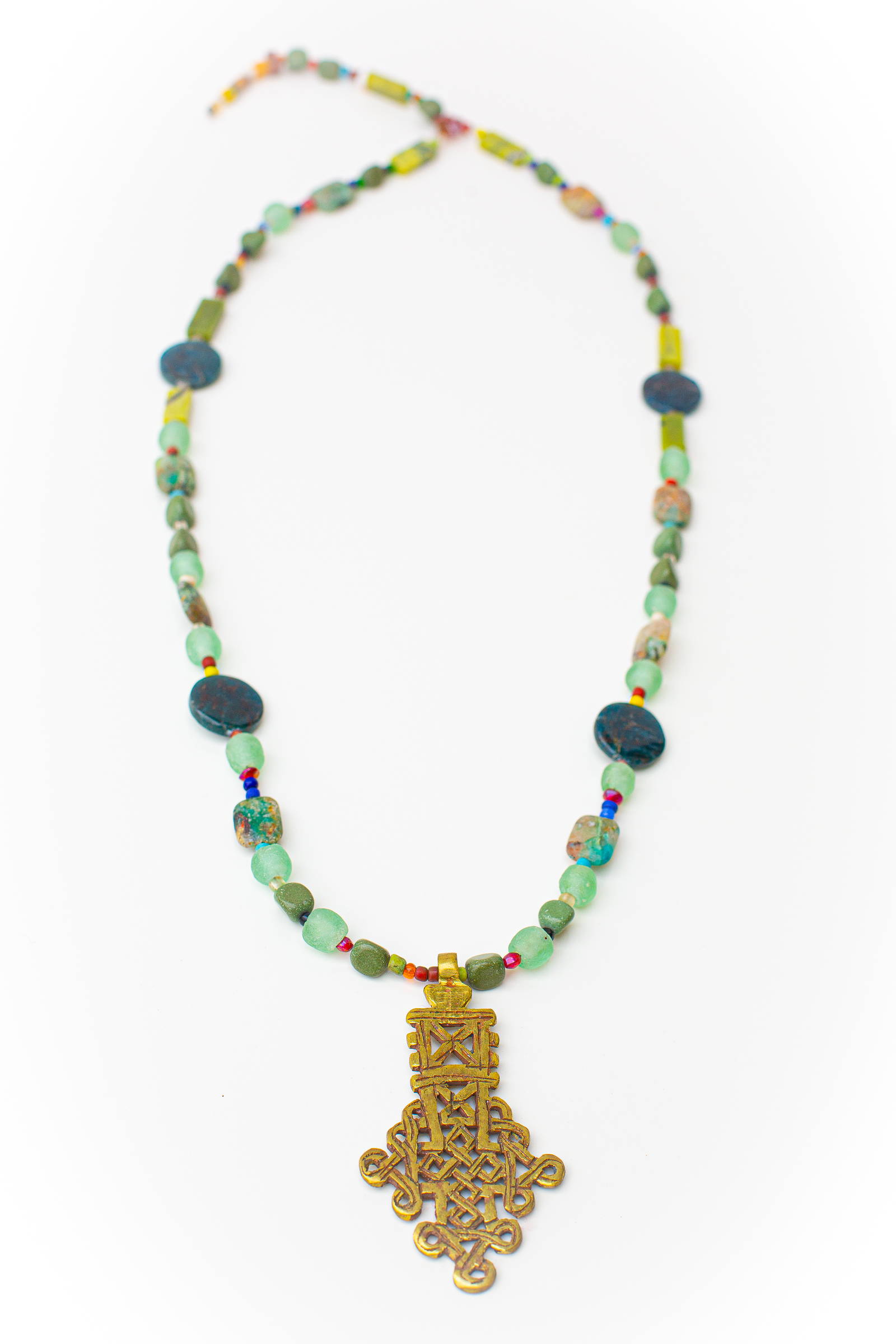An Ethiopian cross as the pendant, this sturdy and substantial necklace is strung with stone and recycled glass African beads, and is 32” in length. The finial tail finishes off the necklace with an additional 4” of beads, making a clasp not necessary.