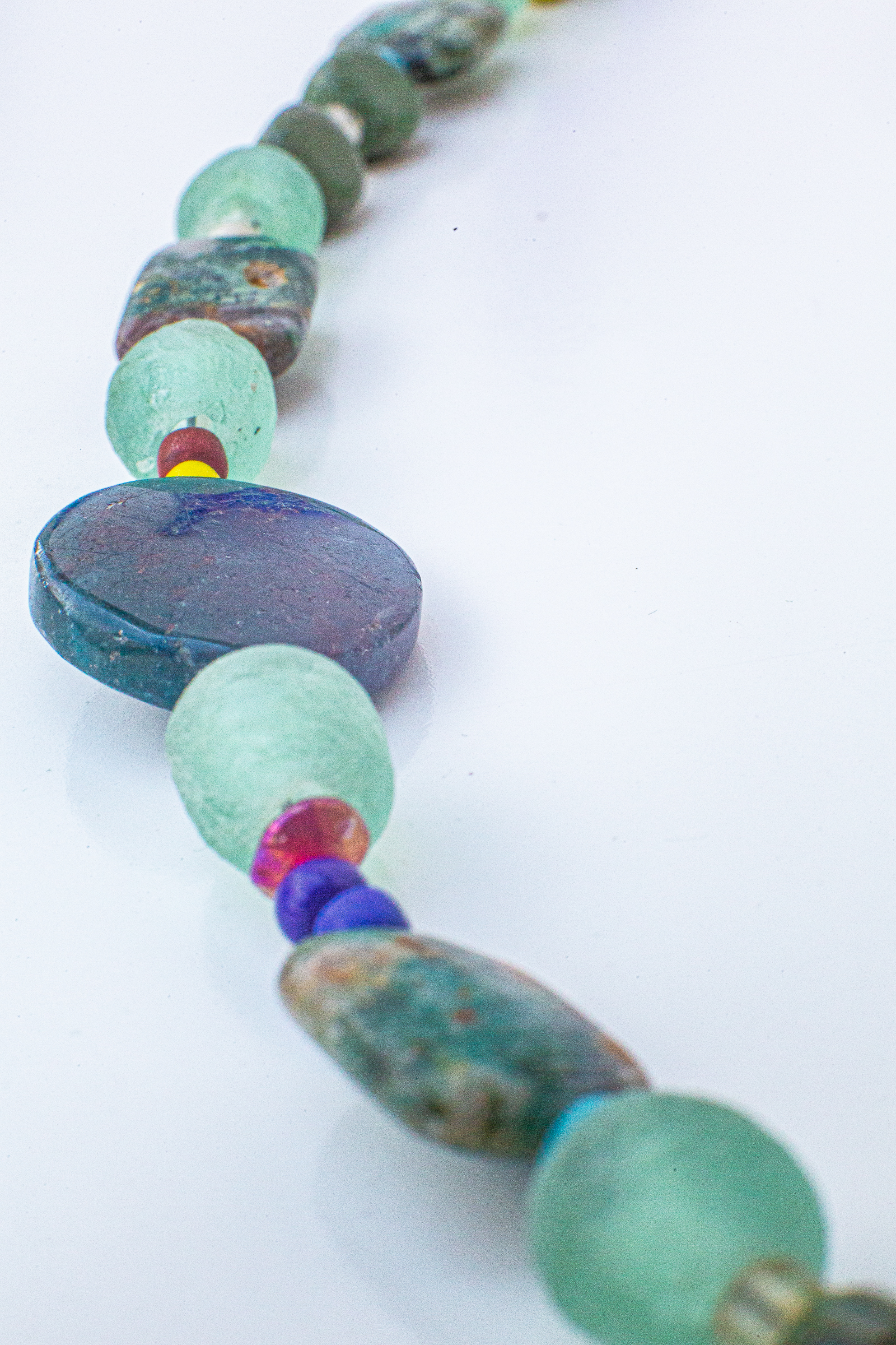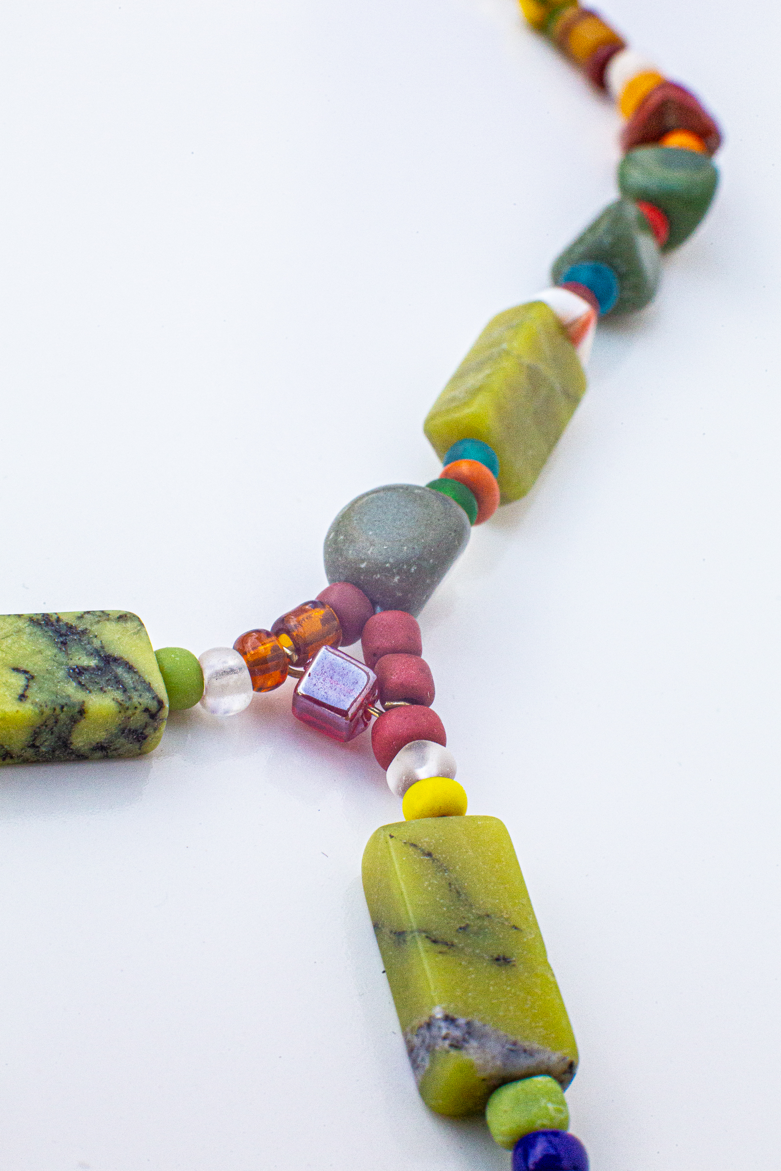 Each is one of a kind, and made by me. Many include re-purposed or vintage beads, beads and pendants from diverse cultures, made of natural materials, and some pendants hand-crafted by me.Each necklace comes in a green felt bag.